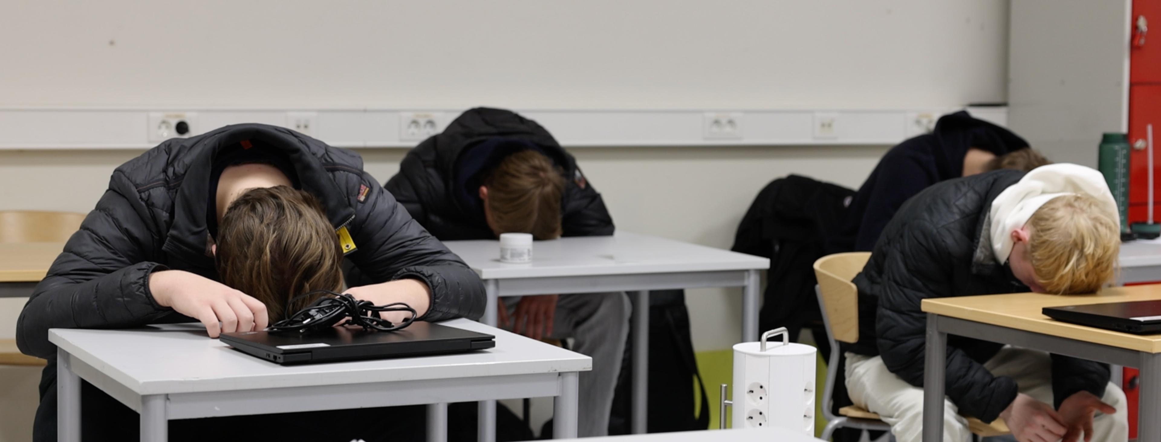 - Trekk stolen litt unna pulten og hvil hodet på bordet.