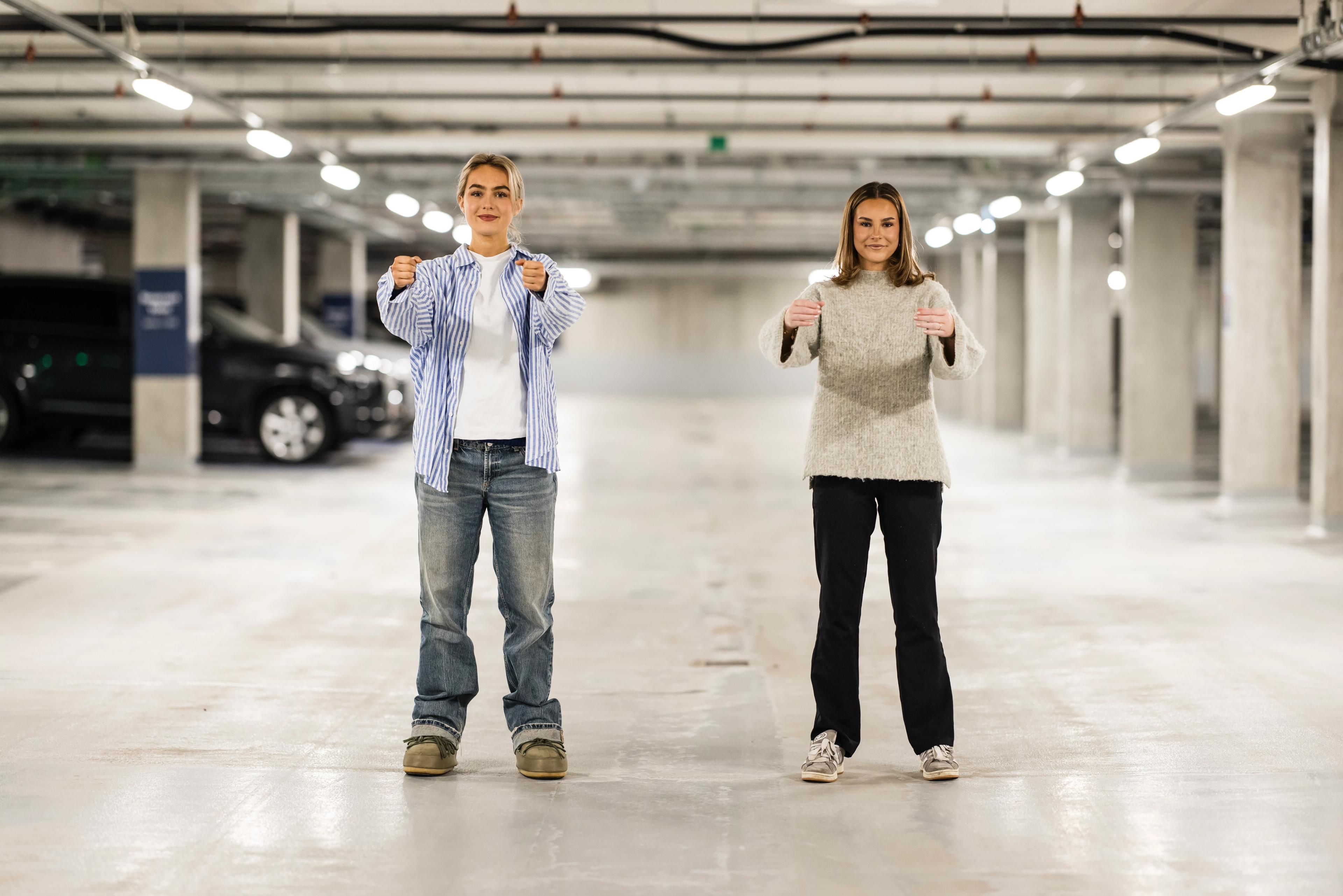 Stå rett opp og ned, og lat som om du holder i et ratt. Se for deg at du skal falle mot underlaget uten å ta deg for.